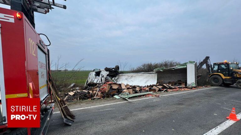 Evenimentul rutier a provocat blocarea totală a circulației în zonă, după ce încărcătura de mere s-a răsturnat pe suprafața carosabilă. Autoritățile au fost nevoite să utilizeze un utilaj specializat pentru a curăța drumul și a relua traficul.